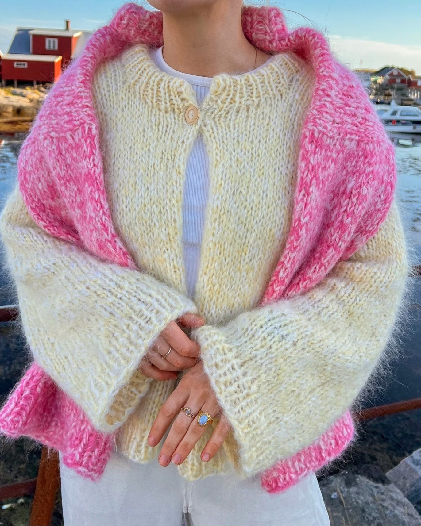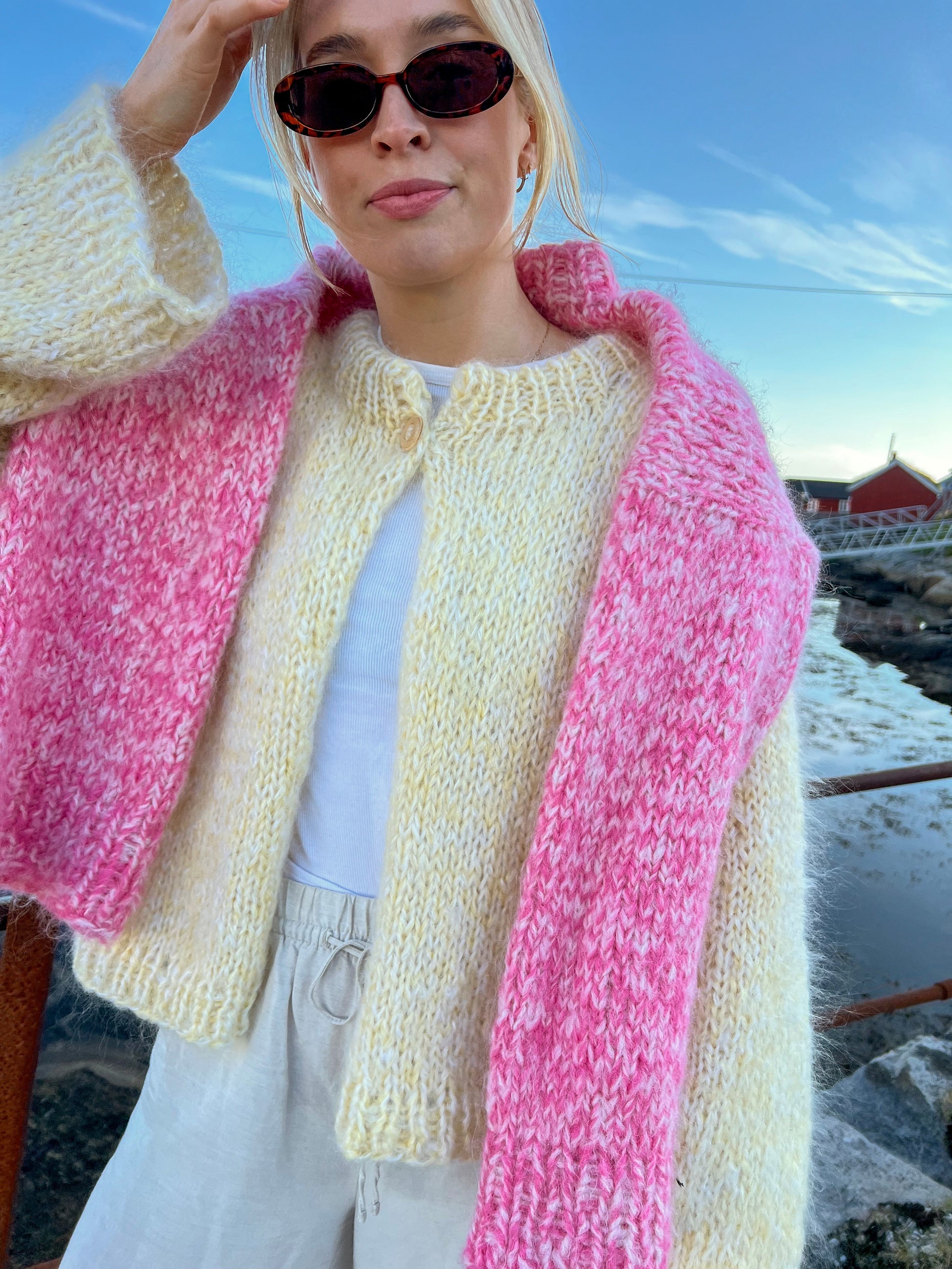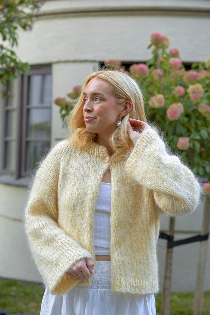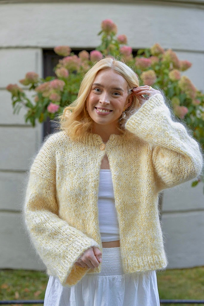 Lemoncardi strikkes i dobbelt tråd Påfugl in Paris. Den strikkes i en tråd med basefarge hvit, sammen med en tråd med ønsket kontrastfarge.